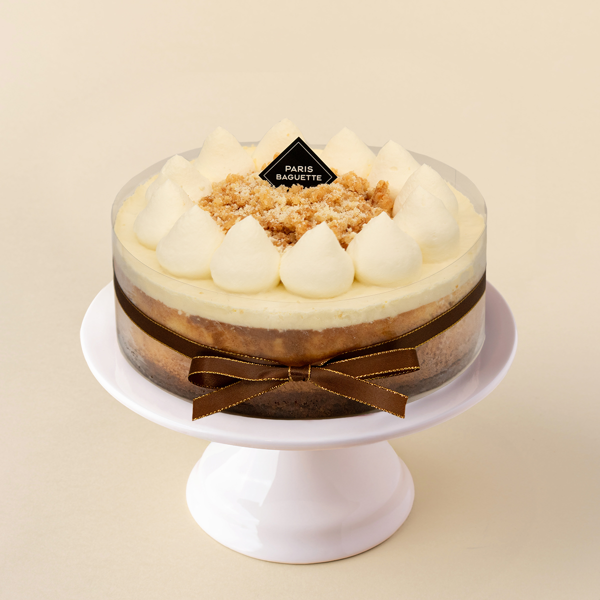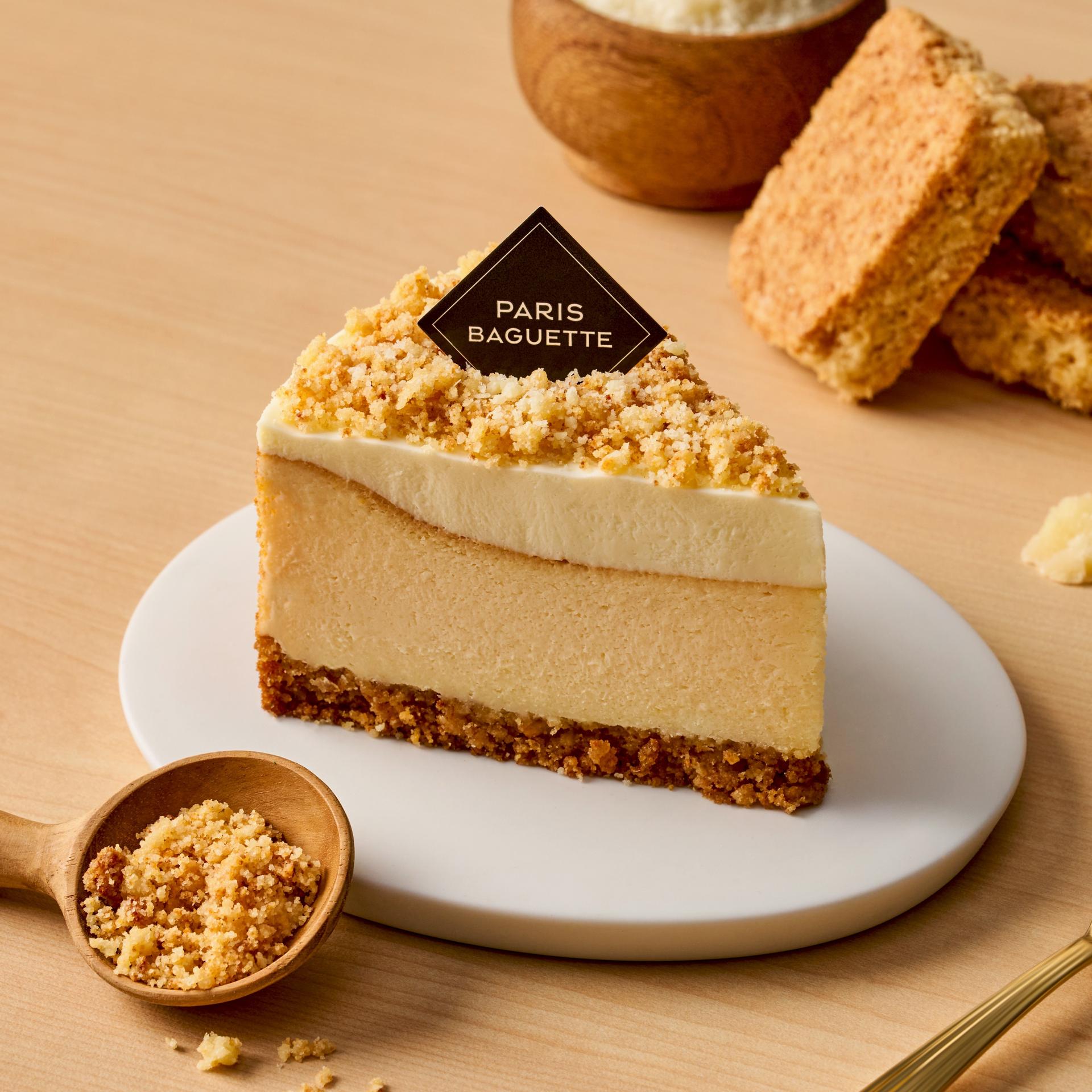 Rich Parmesan cheesecake on a savoury crust, layered with mascarpone cream and topped with a delicate Parmesan crumble.