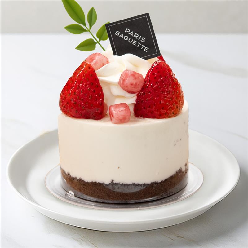 Fluffy fresh cream meets chewy strawberry mochi and juicy strawberry filling, all resting on a rich choco sponge base.
